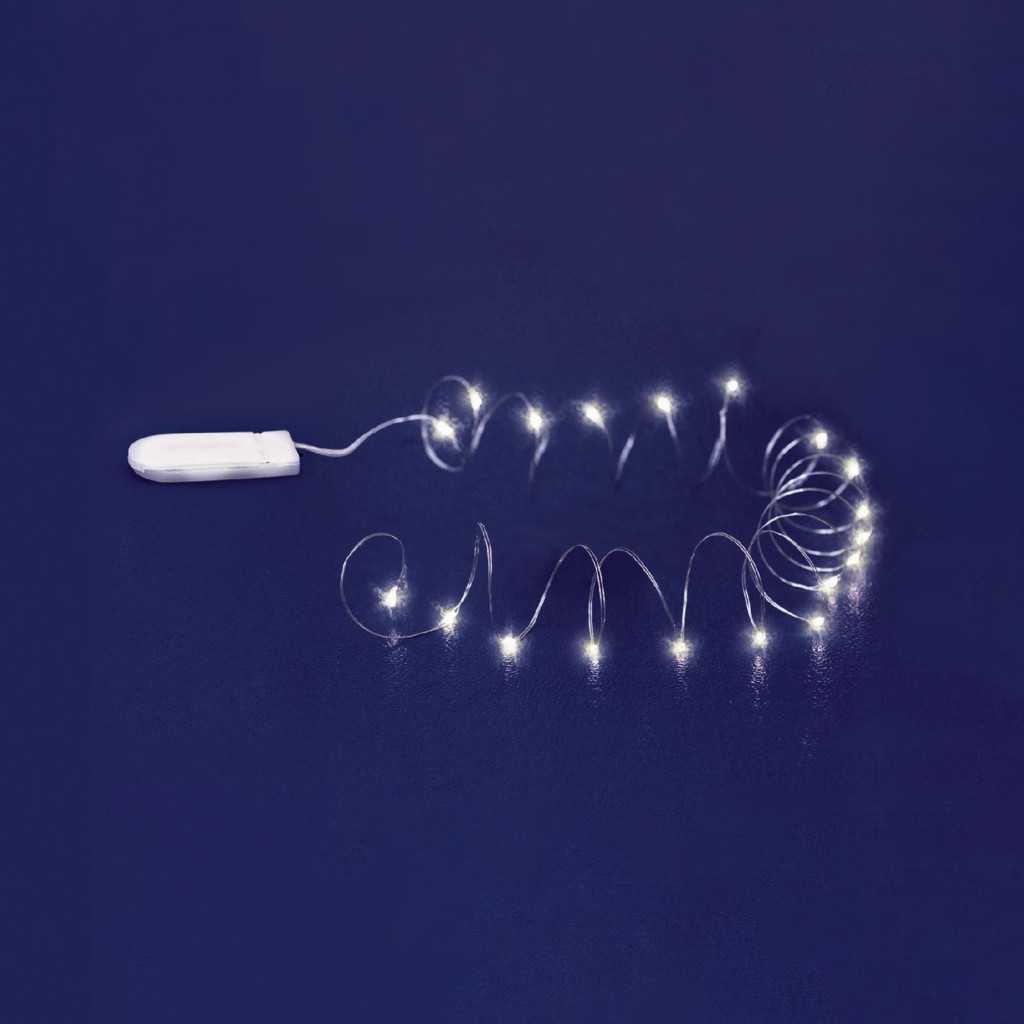 Home MLF 26/WH micro LED-es fényfüzér, 2 m / 20 db hidegfehér micro LED, állófényű, átlátszó vezeték, időzíthető, gombelemes, lapos elemtartó, beltéri kivitel