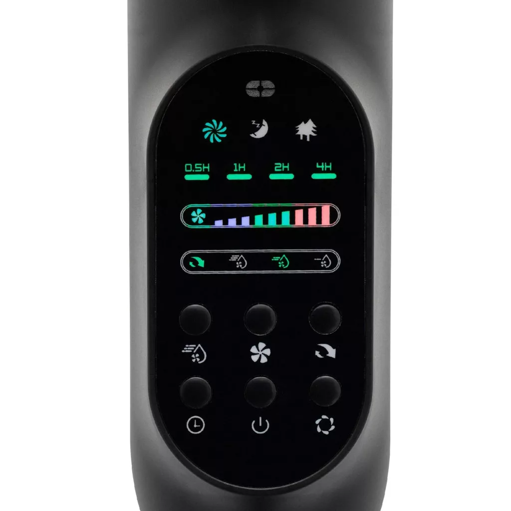 Ez a készülék nem csupán ventilátorként szolgál, hanem a 2,8 literes, felülről tölthető víztartályának köszönhetően párásítóként is funkcionál. A párásítás szintje három fokozatban állítható be, önállóan is használható, maximum 220 g/óra párásítási kapacitással. Az időzítő funkció lehetővé teszi a kikapcsolás beállítását 0,5-7,5 óra között, így éjszakára is tökéletes választás. A készülék könnyű mozgathatóságát a kerekek biztosítják. A távirányító működéséhez 2 db 1,5V-os (AAA) elem szükséges, amely nem része a csomagnak. A ventilátor tápellátása: 220-240V~ 50/60Hz, 75W.