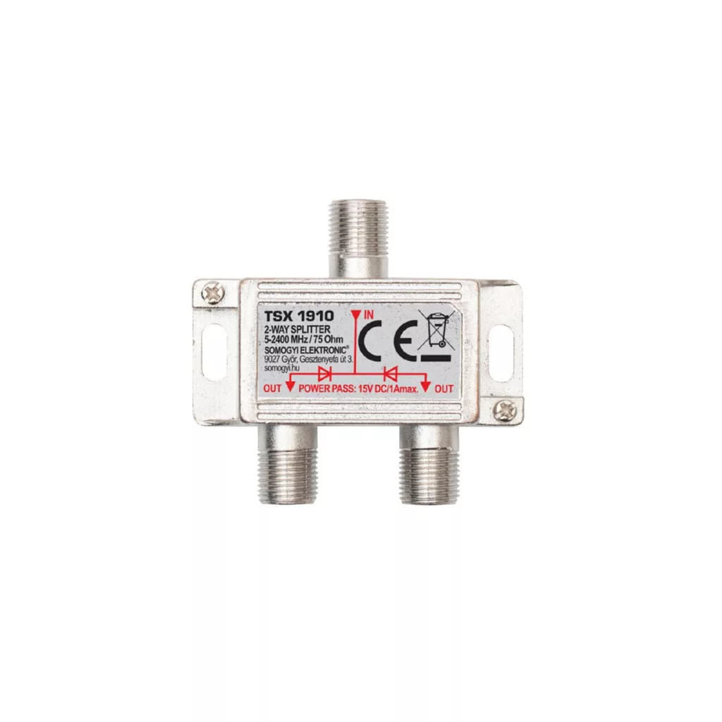 Home TSX 1910 F elosztó, HQ professzionális minőség, 75 Ohm, IP44, cink-ötvözet konstrukció, 5-2400 MHz, 2 utas, 1 bemenet, 2 kimenet