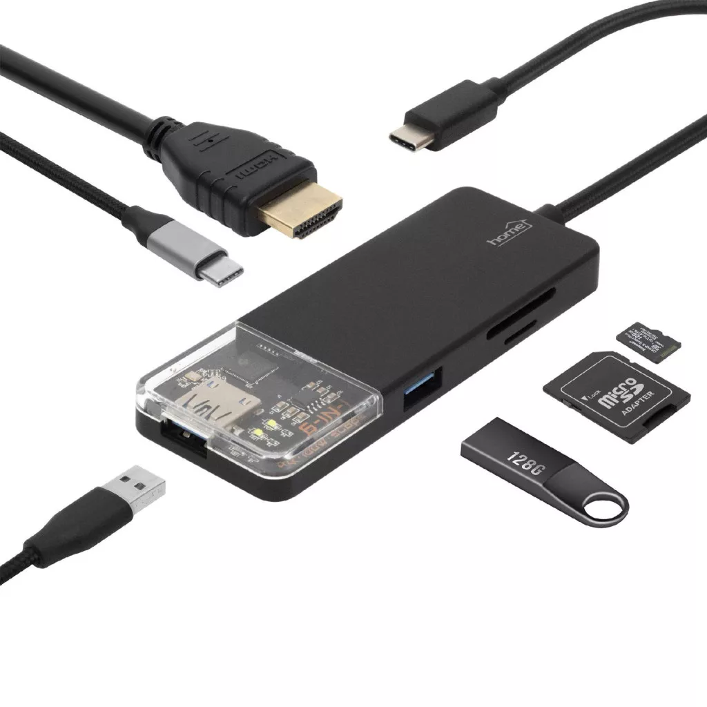 Home USBHUB6 dokkoló állomás, 4K HDMI, egér, billentyűzet, TF/microSD, SD, USB tároló, merevlemez, ~100 W PD, plug & play, LED visszajelzés