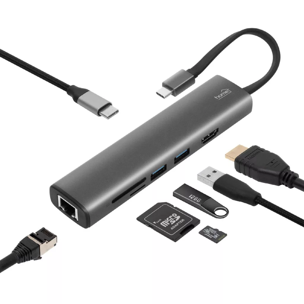 Home USBHUB7 dokkoló állomás, Gigabit RJ45, 4K HDMI HDR, egér, billentyűzet, TF/microSD, SD, 2 TB USB tároló, merevlemez, ~100 W PD, plug & play