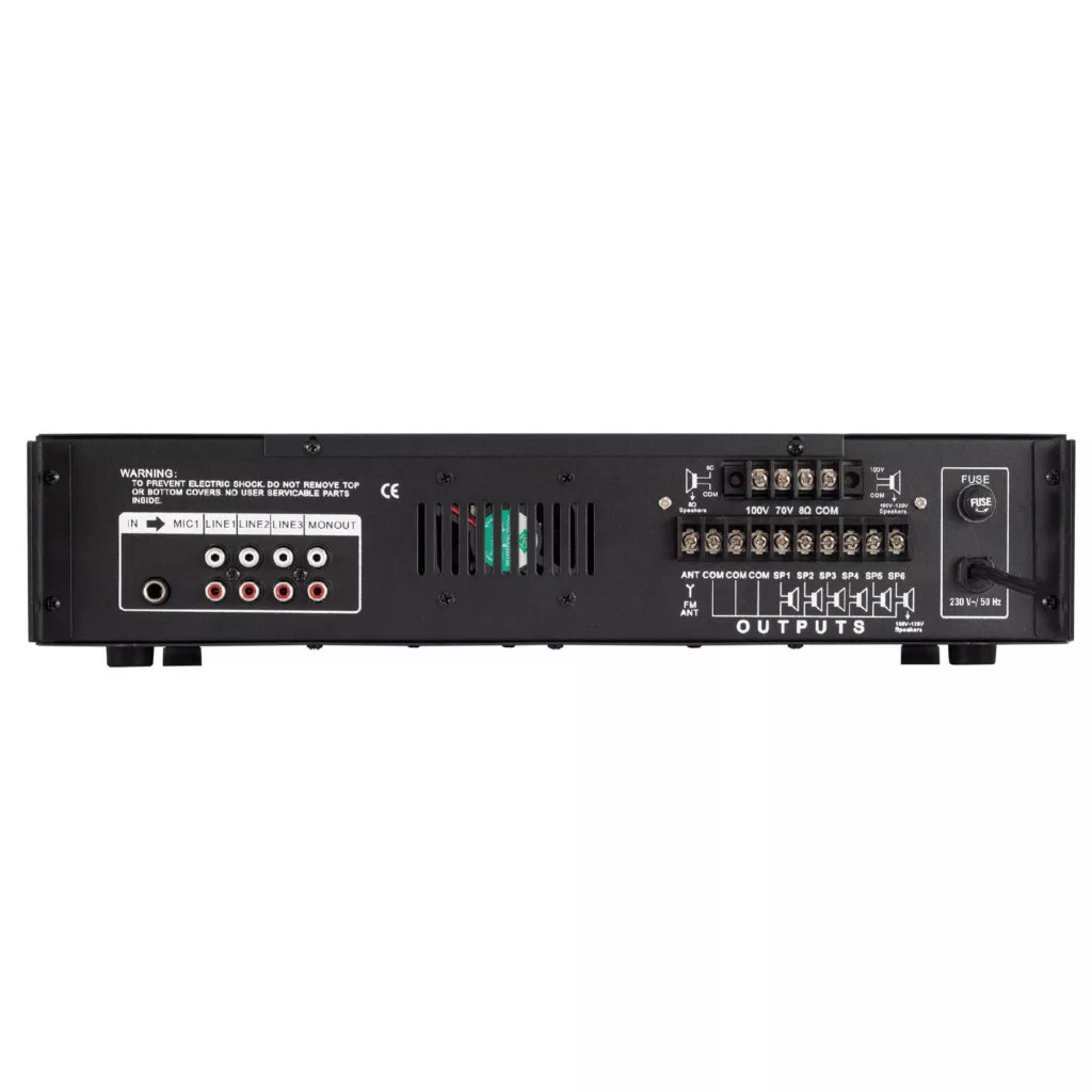 A 100 V-os hangszórókhoz 6 független csoportba köthető és szabályozható csatlakozásokat kínál. A kimeneti lehetőségek között RCA (mono) kimenet is szerepel, amely további erősítők vagy hangrögzítők csatlakoztatását teszi lehetővé. A 230 V-os tápellátás és a masszív, 6,8 kg-os kivitel hosszú távú megbízhatóságot garantál.