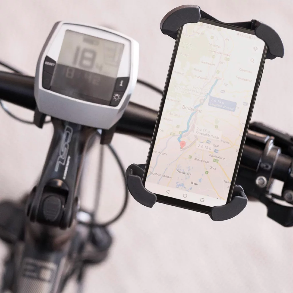 SAL SA065 kerékpáros, rolleres mobiltartó, masszív tartóbilincs, biztonsági retesz, védett sarokelemek, gumi és szilikonbetétek, 18 - 45 mm kormányátmérőre
