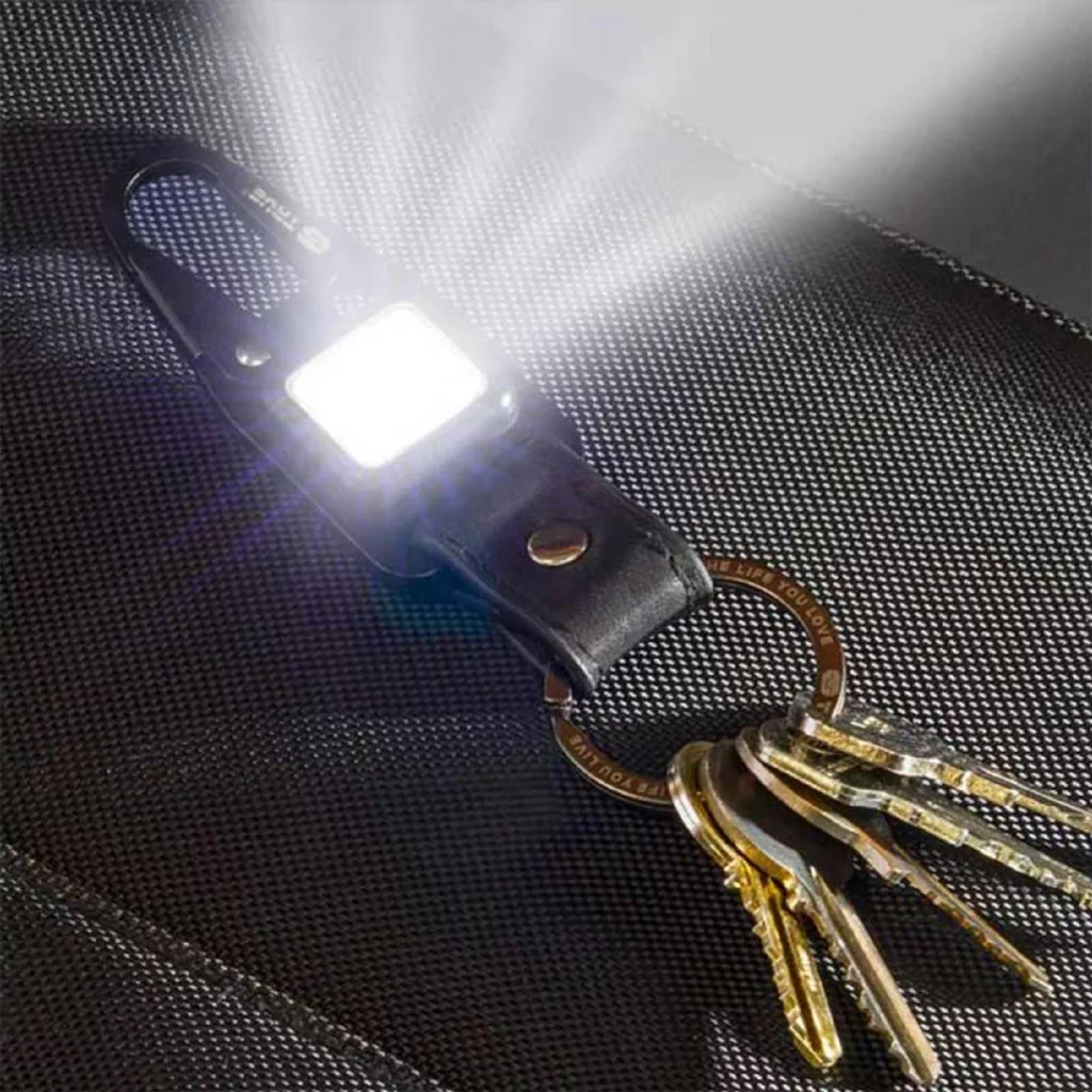 kulcstartó karabíner és tölthető lámpa • 4 funkció: nagy fényerejű statikus fehér / kis fényerejű statikus fehér / statikus piros / villogó piros fény • 47 lm COB LED • akár 20 óra üzemidő • beépített Li-ion akkumulátor • tartozék micro USB töltőkábel és beépített micro USB aljzat • rozsdamentes acél váz • valódi marhabőr szíj