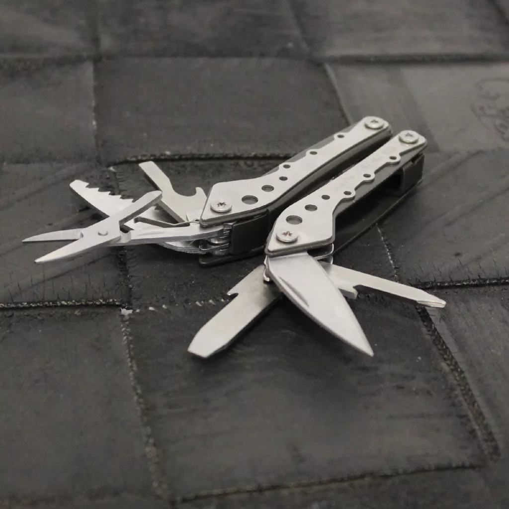 10 funkció • csillagfejű csavarhúzó, olló, sörnyitó, közepes laposfejű csavarhúzó, fűrész, rugós, rozsdamentes harapófogó, drótvágó, nagy laposfejű csavarhúzó, reszelő, kés