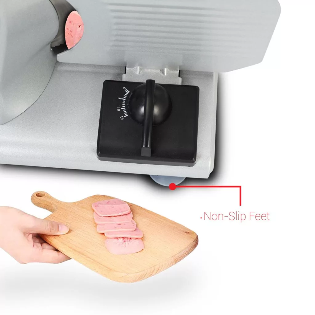 A szeletelőgép időközi és folyamatos I/0/II kapcsolóval rendelkezik, amely lehetővé teszi az adott feladathoz leginkább megfelelő működési mód kiválasztását. A csúszásmentes talpak biztosítják, hogy a készülék használat közben stabilan a munkafelületen maradjon, még intenzívebb igénybevétel során is.
